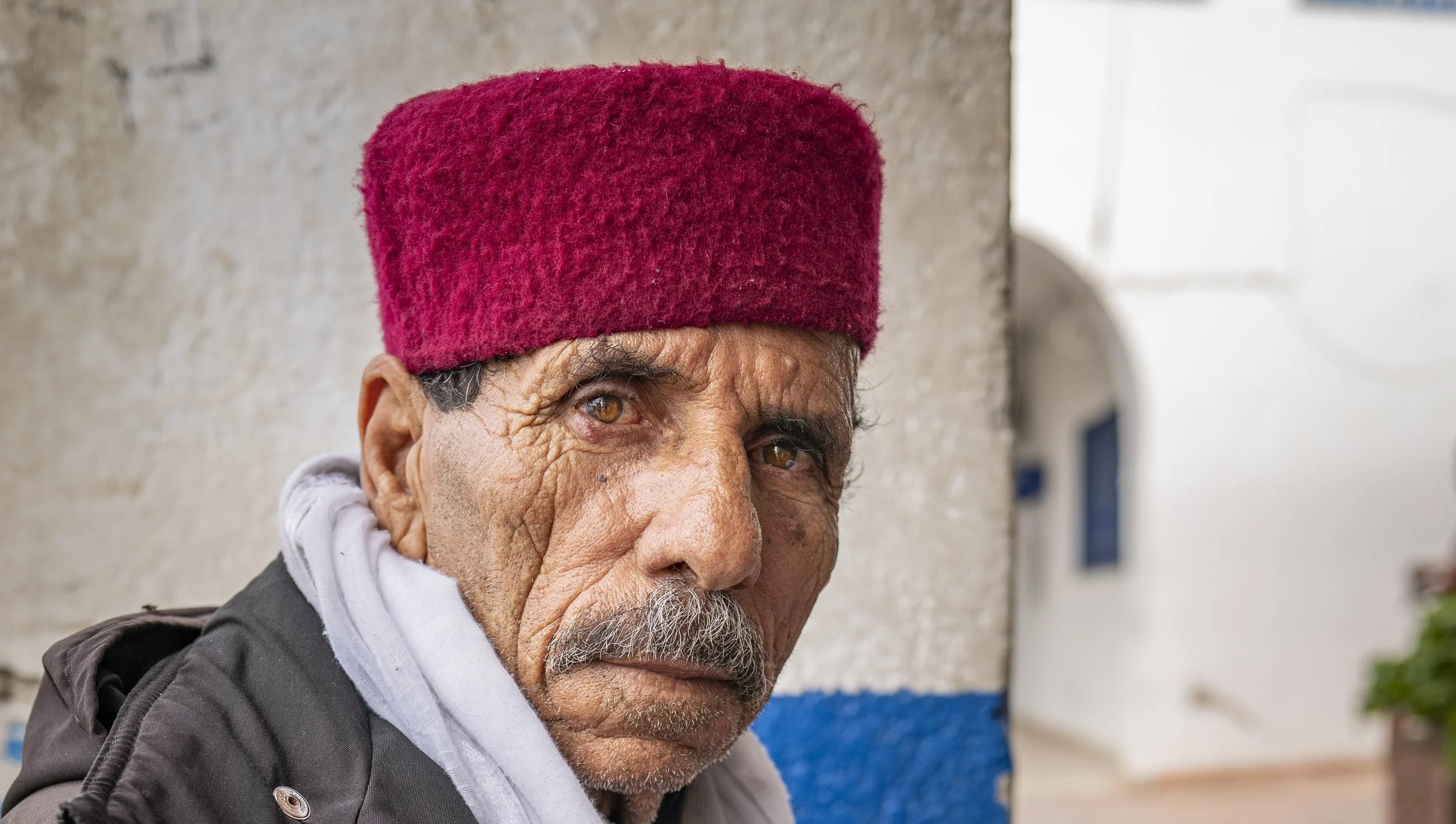 Die Sonne brennt flach über der Altstadt, der Ockerton der Häuser trägt Geschichten in jedem Riss. Auf dem Markt drängen Händler, Stimmen überschlagen sich, Gewürzaromen ziehen durch die Gassen. Dort, an einer Ecke, sitzt er: ein Gesicht, das die Zeit gelesen hat. Falten wie Kartenlinien, Augen wie zwei Meere — ruhig, wachsam, unerschütterlich. Ein schlichter Schal um den Hals, Hände, die Arbeit und Würde zugleich verraten.
